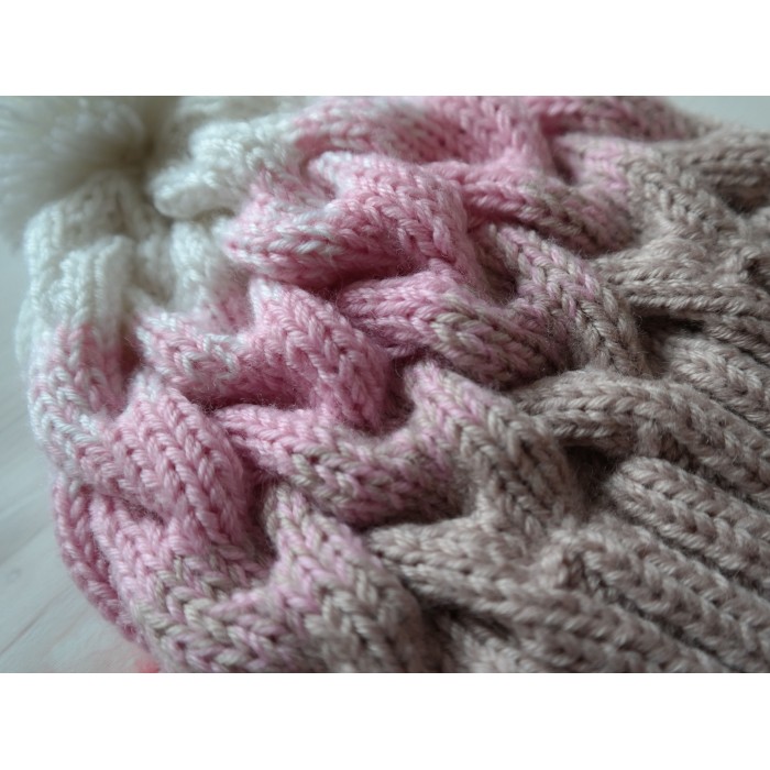 „Różowa Mgiełka" to ręcznie robiona czapka na drutach, wykonana z wyjątkowo miękkiej i ciepłej włóczki. Stylowy pompon oraz modny kolorystyczny gradient od beżu, przez róż, aż po biały, czynią tę czapkę idealnym dodatkiem na chłodne dni.