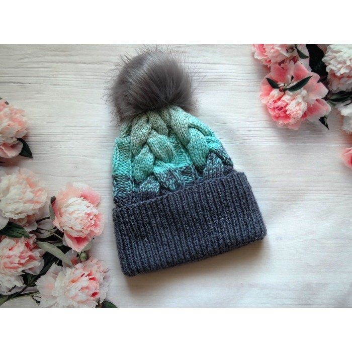 Miętowo-turkusowa czapka z pomponem i warkoczowym splotem – ręcznie robiona